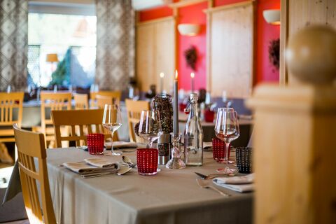 Die warme Stube mit traditionellem Kachelofen lädt besonders nach langen Motorradtouren oder kühlen Abenden zum Verweilen ein. Hier treffen sich Hotelgäste und Einheimische gleichermaßen – ein Ort der Begegnung, an dem man bei gutem Essen und einem Glas Wein die Erlebnisse des Tages Revue passieren lässt.