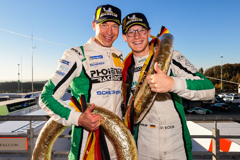Titel für Audi-Kundenteams auf der Nordschleife: Phoenix Racing und Lionspeed by Car Collection Motorsport beendeten die Saison 2021 der Nürburgring Langstrecken-Serie mit großen Erfolgen. Privatfahrer Vincent Kolb gelang nach dreieinhalb Jahren Nordschleife in einem abwechslungsreichen Rennen gemeinsam mit Audi Sport-Pilot Frank Stippler sein erster persönlicher Gesamtsieg. Das Duo gewann im Audi R8 LMS von Phoenix Racing mit 18 Sekunden Vorsprung, nachdem Teams von Porsche und Lamborghini Zeitstrafen wegen Überholens unter Gelber Flagge zurückgeworfen hatten. Damit geht die SP9-Pro-Wertung der Meisterschaft an den Frankfurter Nachwuchspiloten Vincent Kolb. Zugleich gewann Phoenix Racing die Speed-Trophäe sowie die Nimex Team-Trophäe der Klasse SP9 Pro. Lionspeed by Car Collection Motorsport verbuchte zwar im Rennen einen Ausfall, erhielt mit dem Titel in der Klasse SP9 Pro-Am allerdings den verdienten Lohn für eine insgesamt gute Saison. Patrick Kolb und Lorenzo Rocco hatten ihre Klasse in diesem Jahr vier Mal im Audi R8 LMS des Teams von Peter Schmidt gewonnen. Damit setzten sie sich in der Endabrechnung gegen sieben Konkurrenten durch. Dies beweist einmal mehr, dass der R8 LMS auch für Rennfahrer ohne Profi-Hintergrund auf einer der anspruchsvollsten Strecken der Welt die erste Wahl ist.