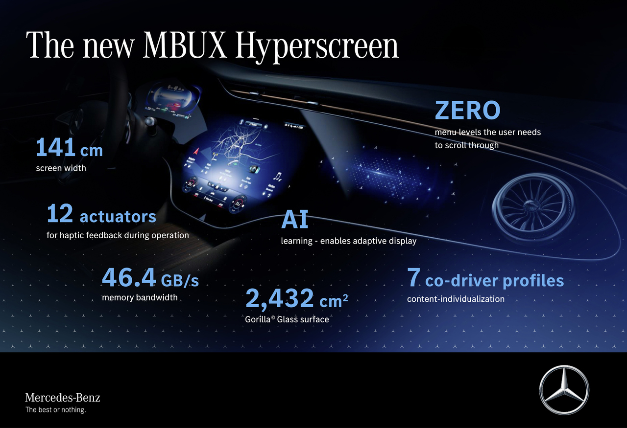 „Der neue MBUX Hyperscreen kombiniert einzigartige Elektro-Ästhetik mit herausragender Nutzerfreundlichkeit. Eine entscheidende Stärke ist die clevere Vernetzung aller Systeme auf Basis einer intelligenten, lernfähigen Software. Das macht den Hyperscreen zum Gehirn des Autos, er ist mit allen Komponenten des Fahrzeugs verbunden und kommuniziert mit ihnen“, so Sajjad Khan, Vorstandsmitglied der Mercedes-Benz AG und CTO.