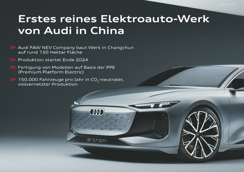 Das neue Werk in Changchun wird der erste Produktionsstandort in China sein, an dem ausschließlich vollelektrische Audi-Modelle vom Band fahren. Mit einer jährlichen Kapazität von mehr als 150.000 Fahrzeugen wird die Fabrik einen zentralen Beitrag zur Elektrifizierung des Audi-Produktportfolios in China leisten. Gebaut werden zunächst drei Modelle auf Basis der Premium Platform Electric, die Audi zusammen mit Porsche entwickelt. Den Anfang machen ein elektrisch angetriebenes SUV und eine E-Limousine.